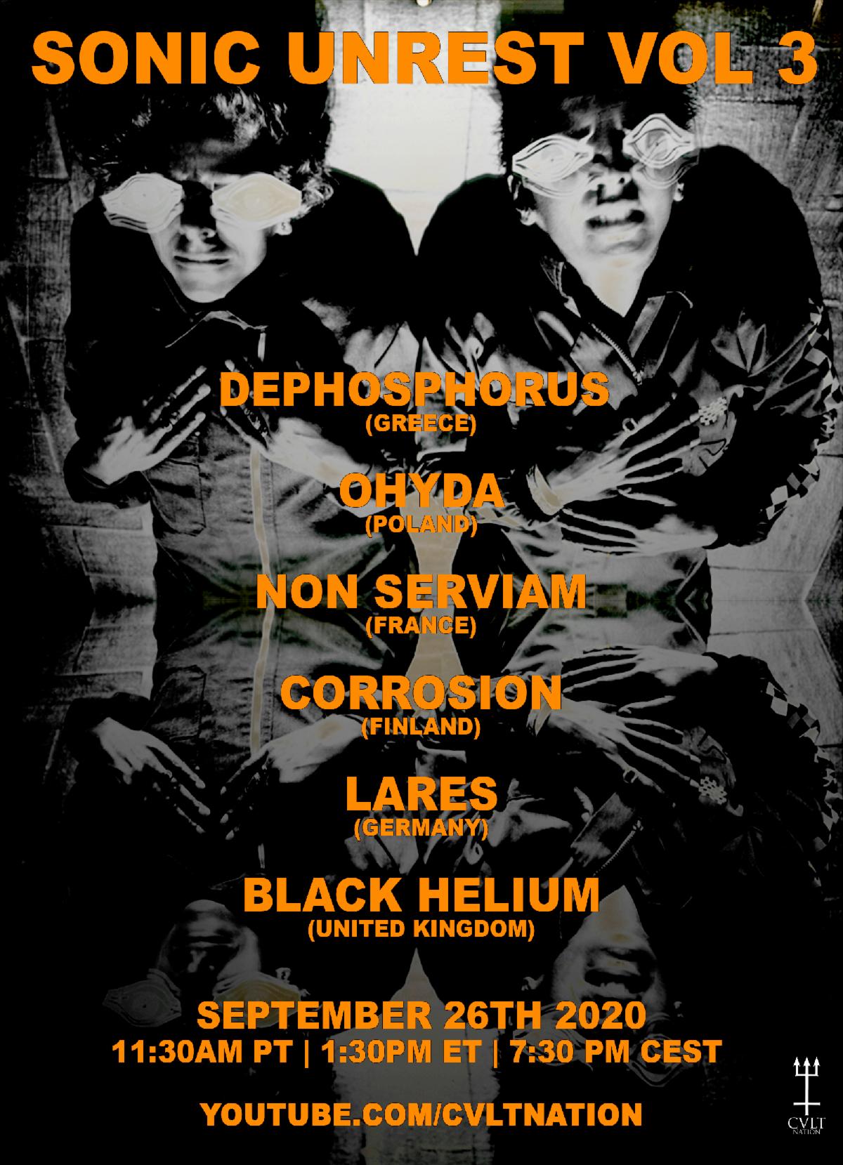 Sonic Unrest Vol. 3 runs from 11:30am PST to 2:45pm PST and features five European bands: Dephosphorus, Ohyda, Non Serviam, Corrosion, Lares, and Black Helium.
