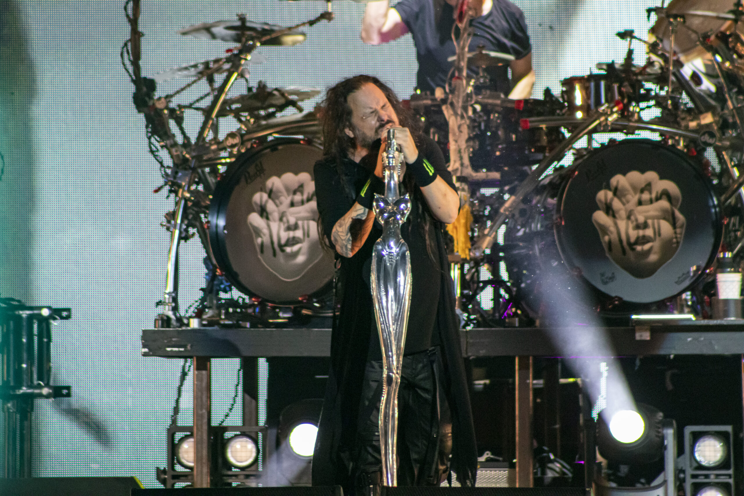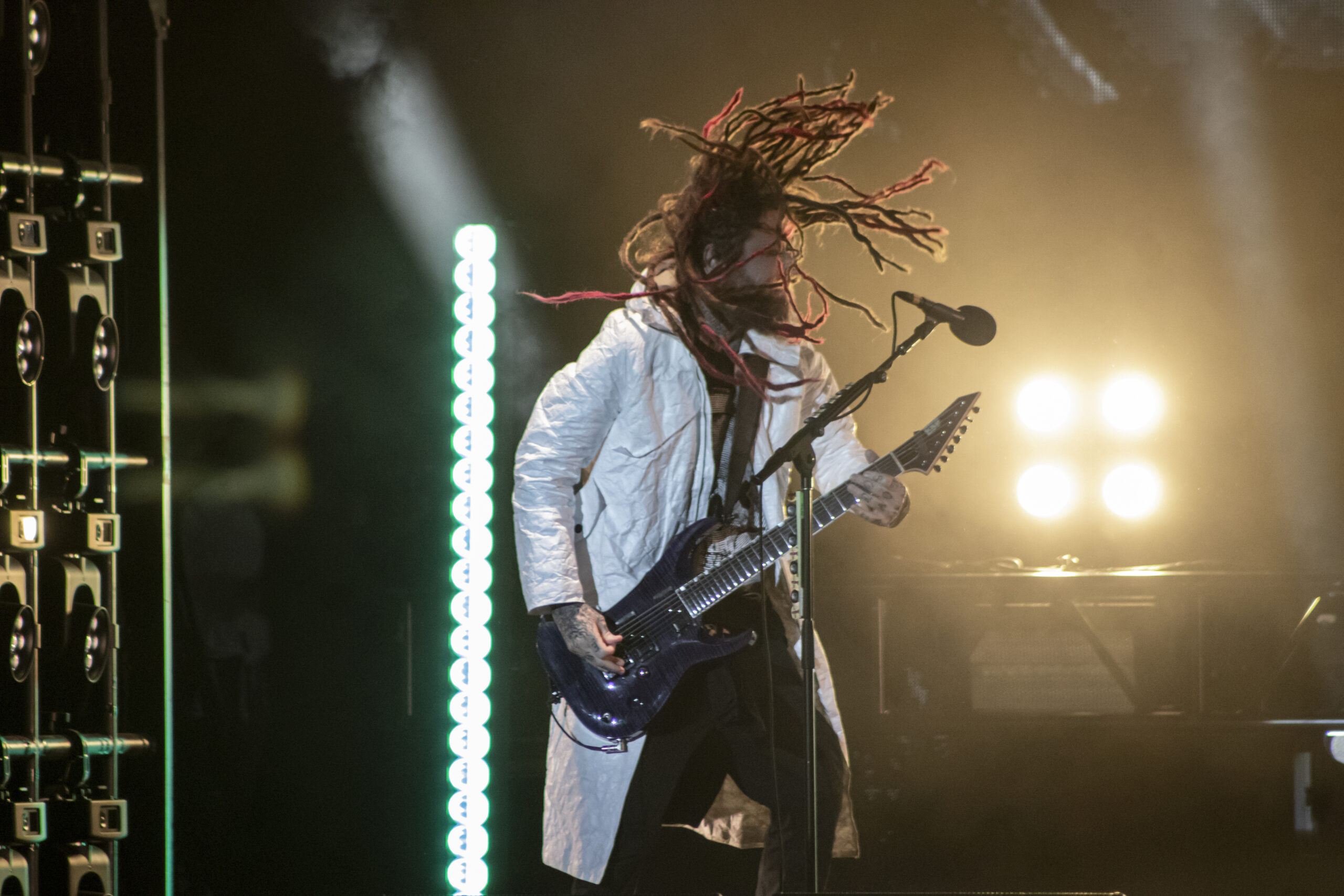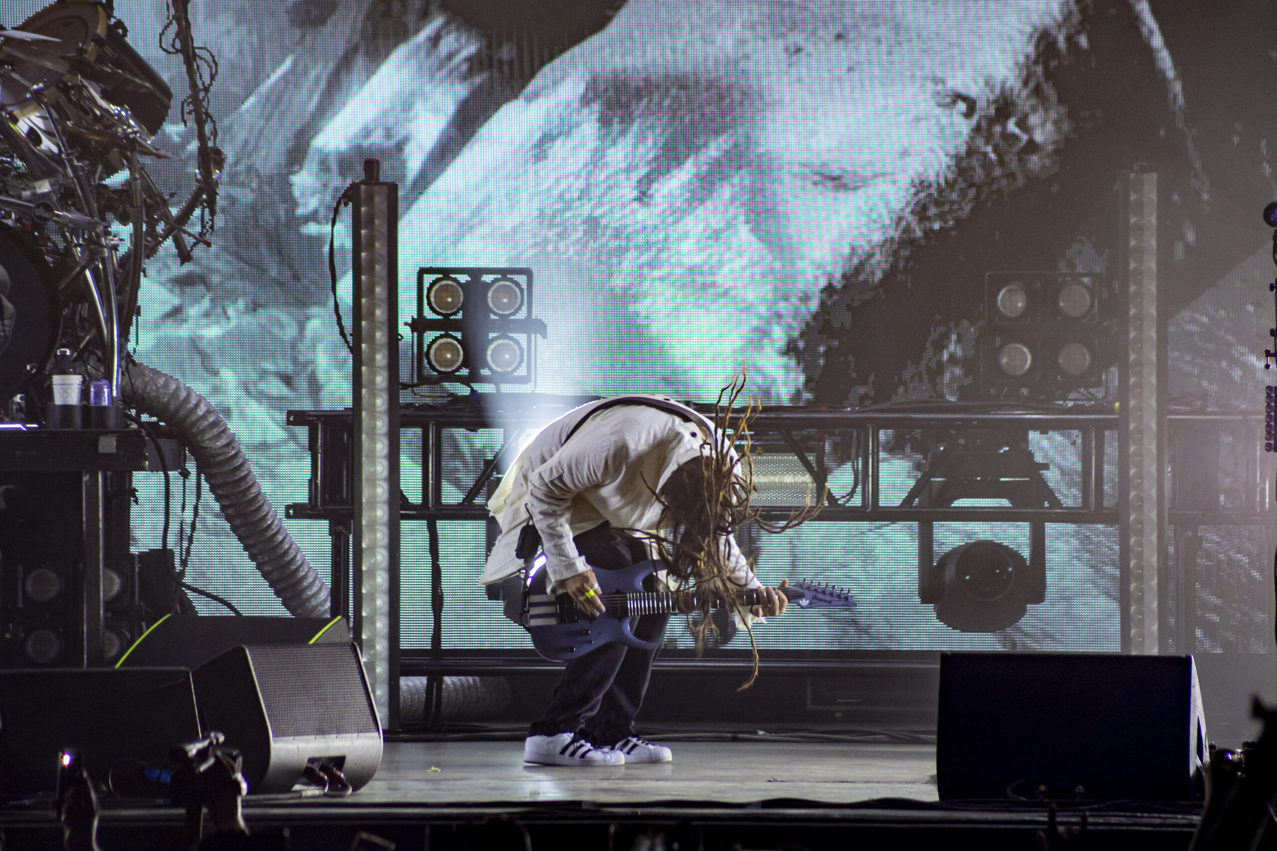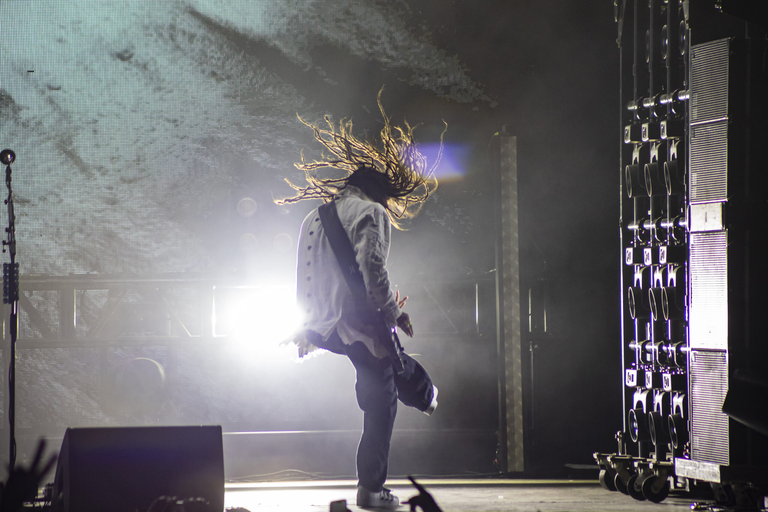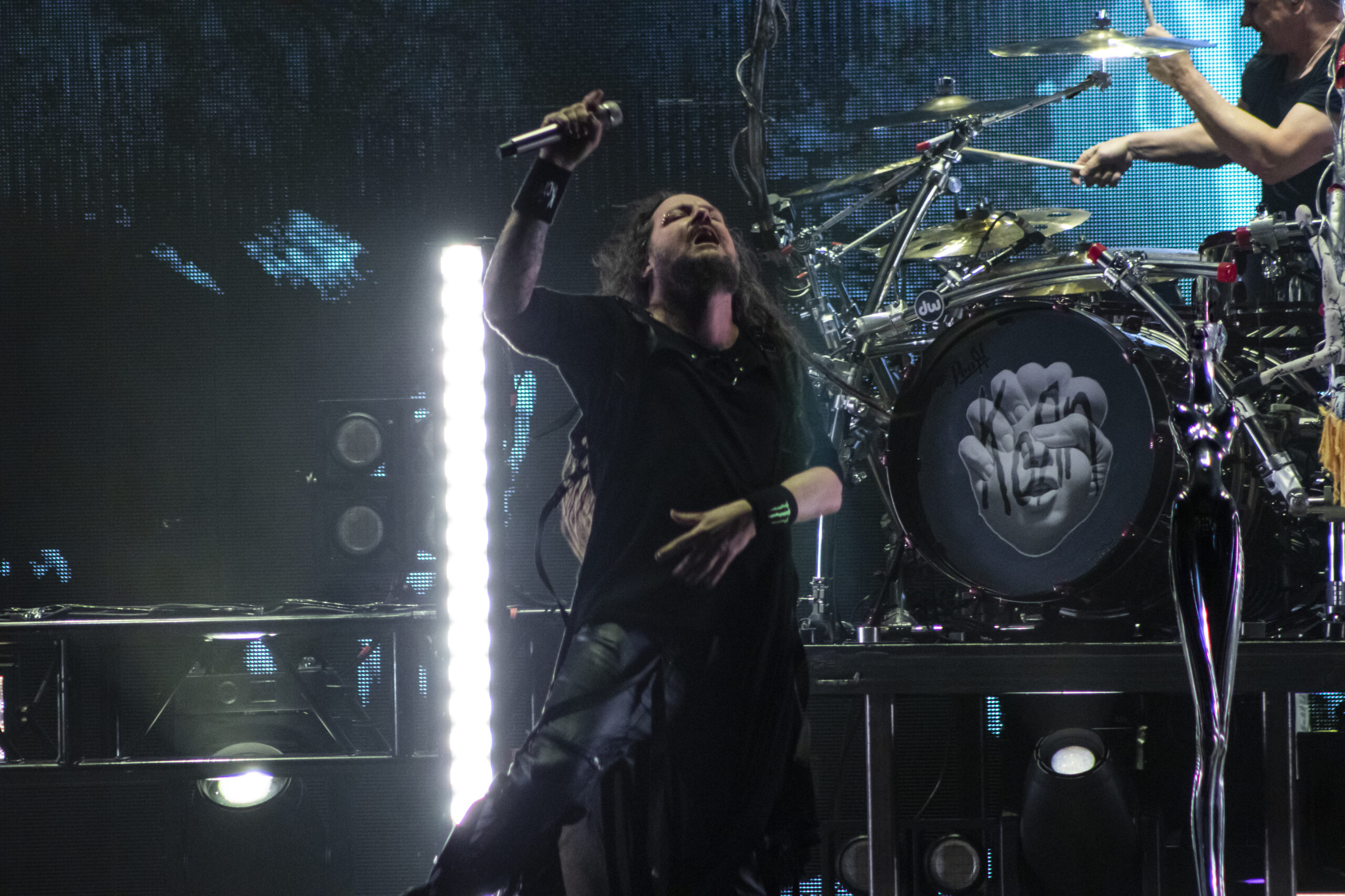With the abundance of “Still a Freak” shirts through the sea of people. It was clear who people were here to see. As the lights turn off a huge “KORN” logo appears on the LED screens on the front of the stage while “4 U” plays overhead. As the song ends the guys take stage BEHIND the LED wall. At first I was unsure of this but you can see them very clearly and the visuals that are displayed on them are pretty trippy. 1st and 2nd songs were done behind the screen. (Those songs were “Rotting in Vain” and A.D.I.D.A.S.) As the third song was about to start the screen raised up and you had your first “real” glimpse of the boys in KORN as they blasted in with “Here to Stay“. Everyone was showing their true KORN selves. Johnathan with his trademark mic stand headband, Head flipping his dreads around and Munky with his bent over spin. Ray is an absolute beast behind the drum kit and newcomer, but not new to the game, Ra Diaz did an amazing job. We all love and miss Fieldy but Ra did his job and did it very well. With a staggering 16 song set list hitting more old school than I expected the end of the night was quite a surprise for those in attendance with Amy Lee coming out and doing “Freak on a Leash” with KORN. Always an amazing show by these guys. I will be there at the next one for sure.