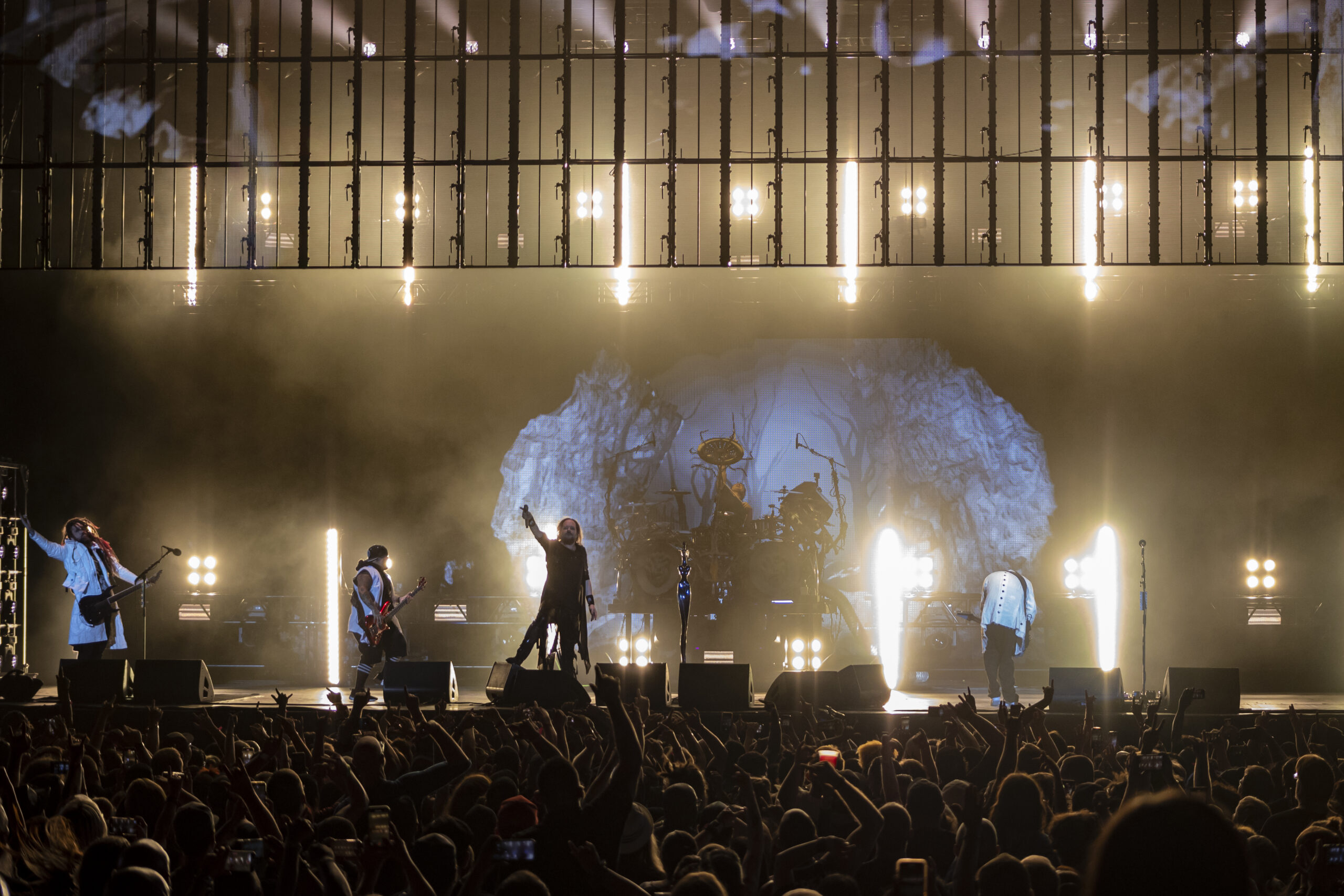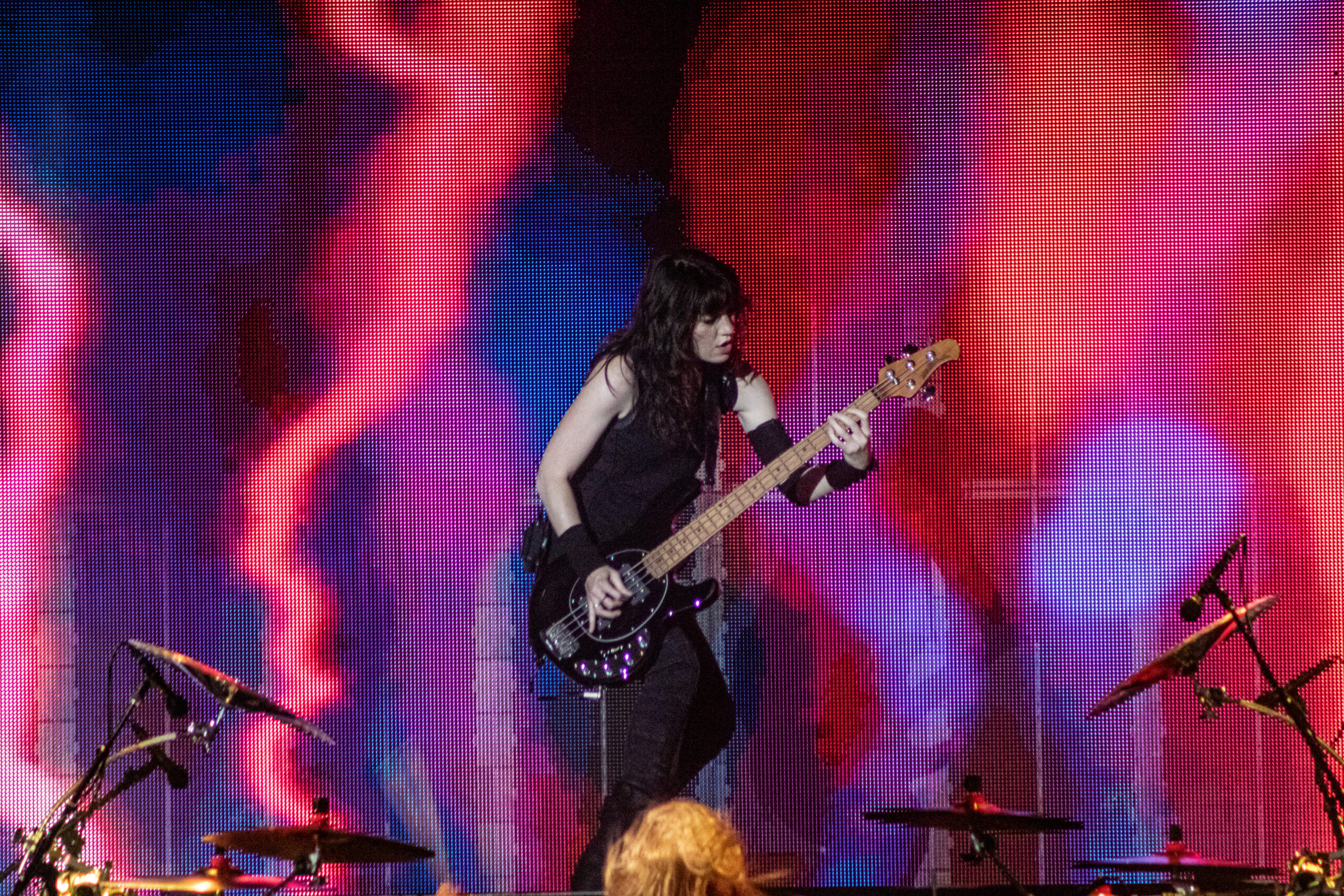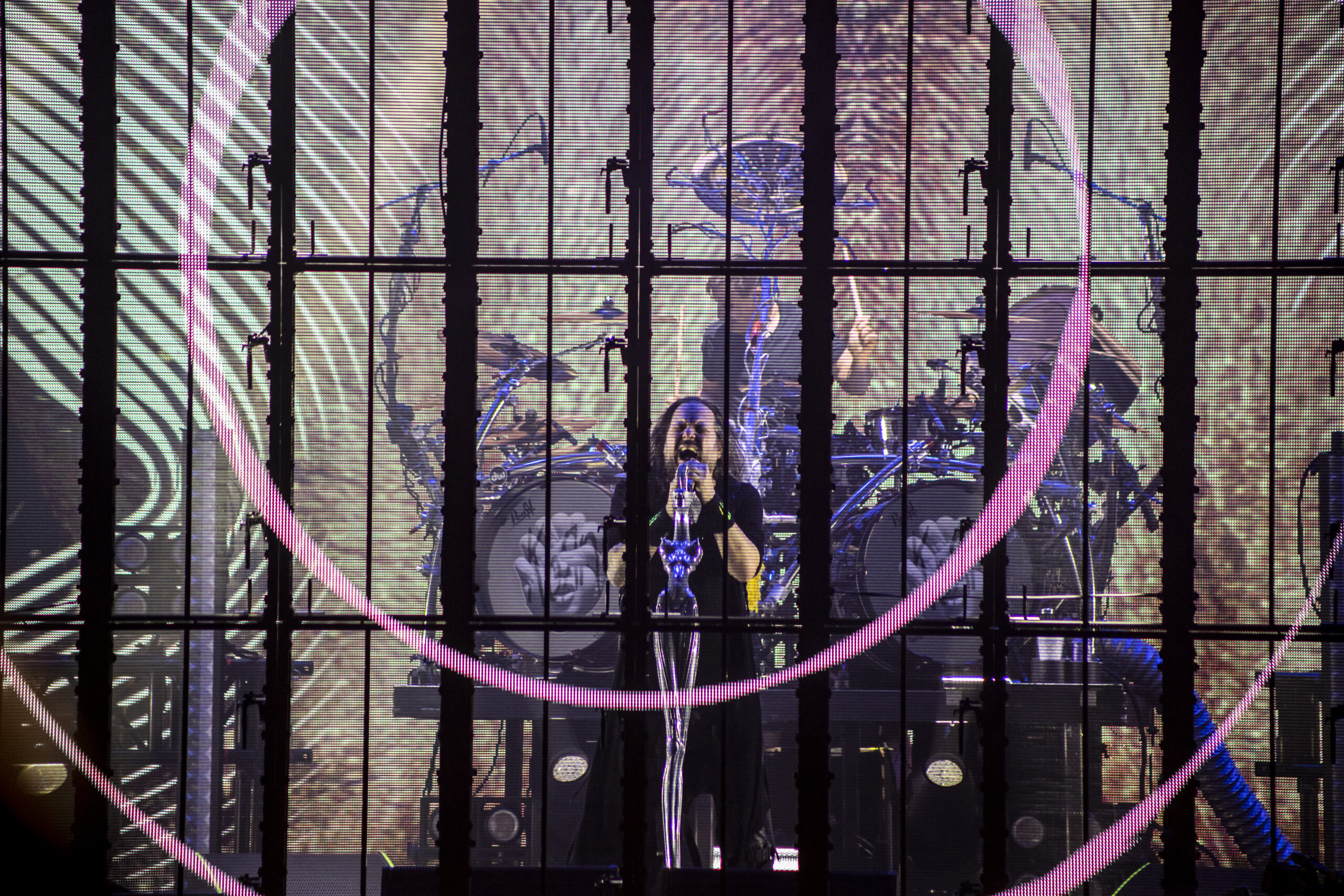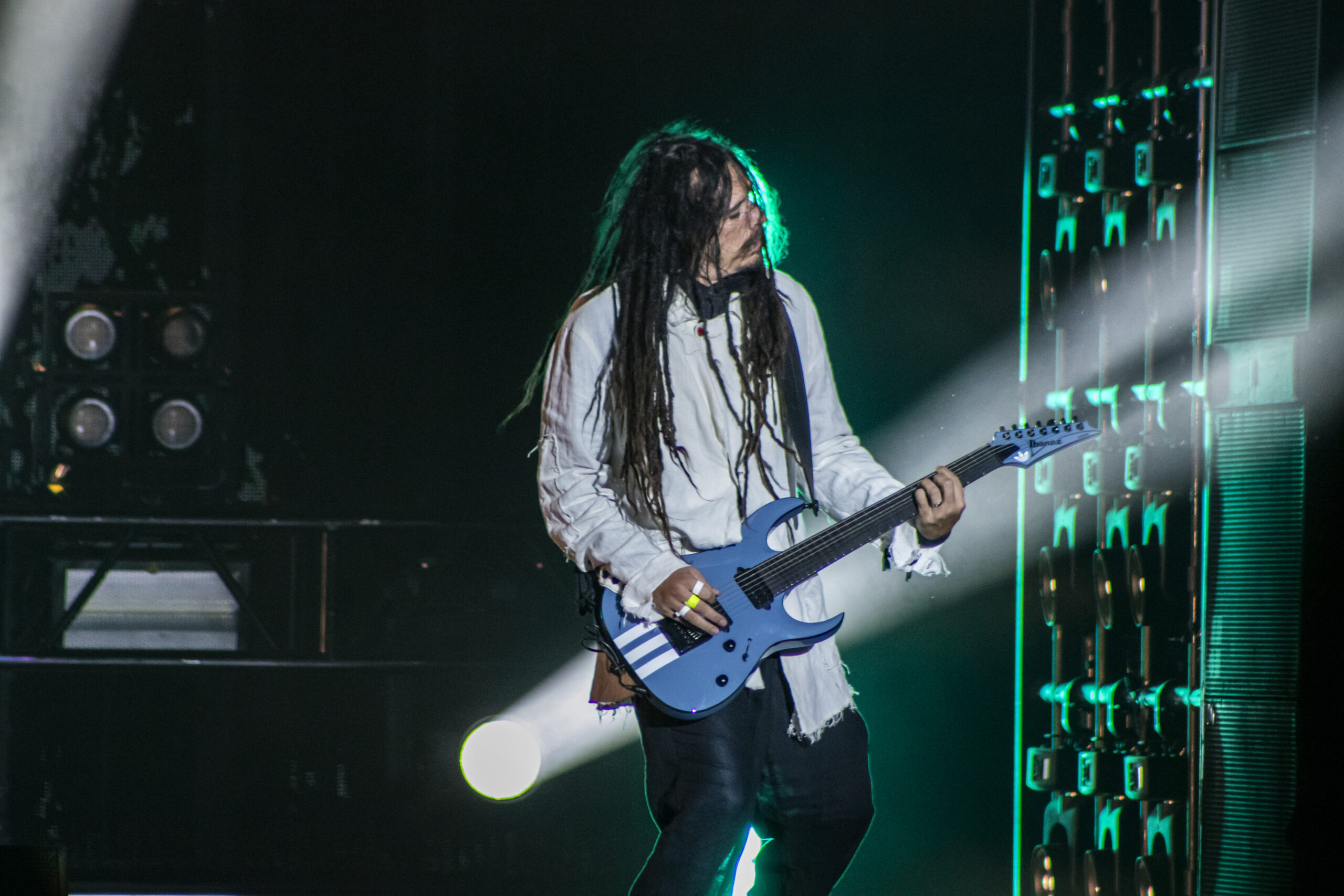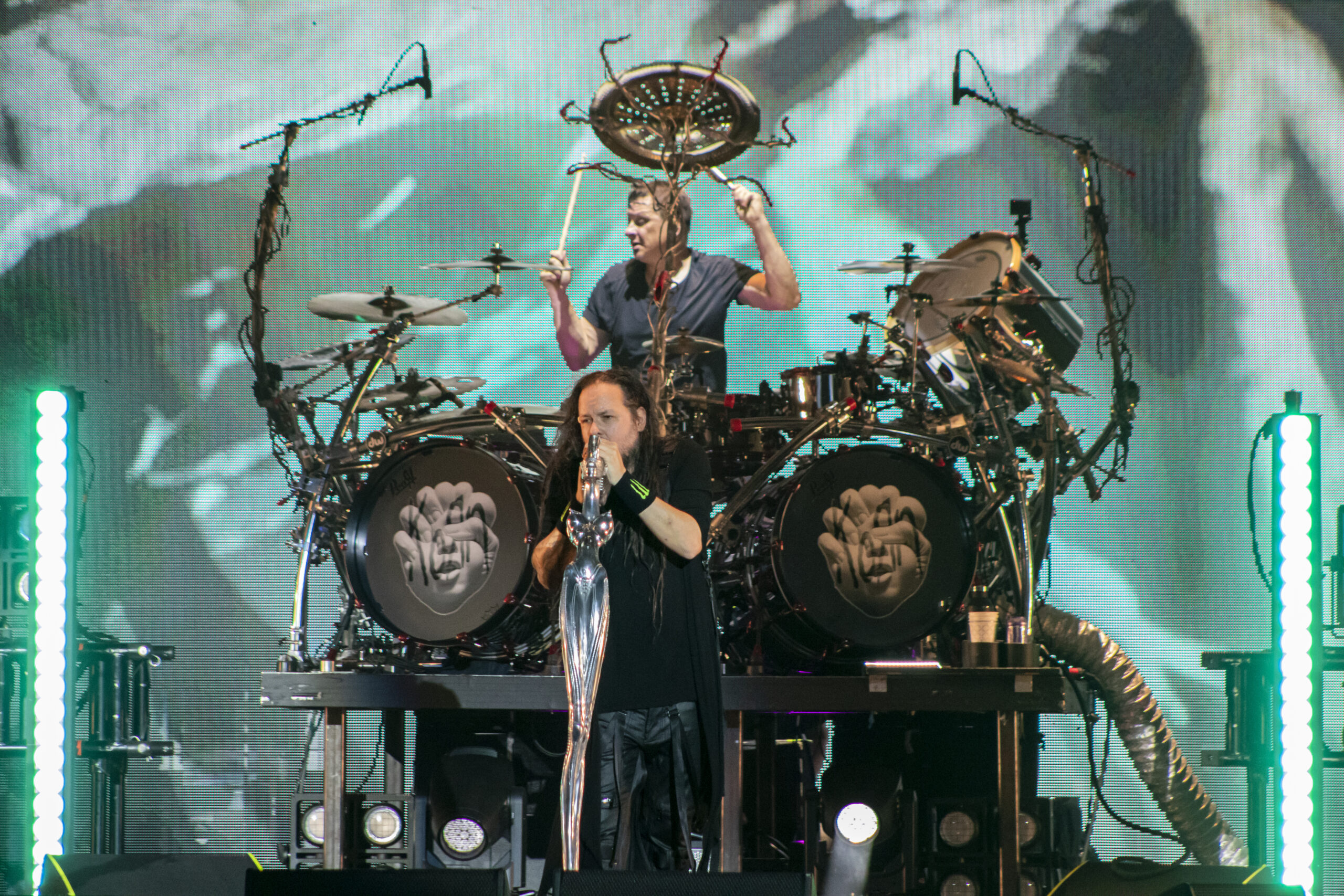With the abundance of “Still a Freak” shirts through the sea of people. It was clear who people were here to see. As the lights turn off a huge “KORN” logo appears on the LED screens on the front of the stage while “4 U” plays overhead. As the song ends the guys take stage BEHIND the LED wall. At first I was unsure of this but you can see them very clearly and the visuals that are displayed on them are pretty trippy. 1st and 2nd songs were done behind the screen. (Those songs were “Rotting in Vain” and A.D.I.D.A.S.) As the third song was about to start the screen raised up and you had your first “real” glimpse of the boys in KORN as they blasted in with “Here to Stay“. Everyone was showing their true KORN selves. Johnathan with his trademark mic stand headband, Head flipping his dreads around and Munky with his bent over spin. Ray is an absolute beast behind the drum kit and newcomer, but not new to the game, Ra Diaz did an amazing job. We all love and miss Fieldy but Ra did his job and did it very well. With a staggering 16 song set list hitting more old school than I expected the end of the night was quite a surprise for those in attendance with Amy Lee coming out and doing “Freak on a Leash” with KORN. Always an amazing show by these guys. I will be there at the next one for sure.