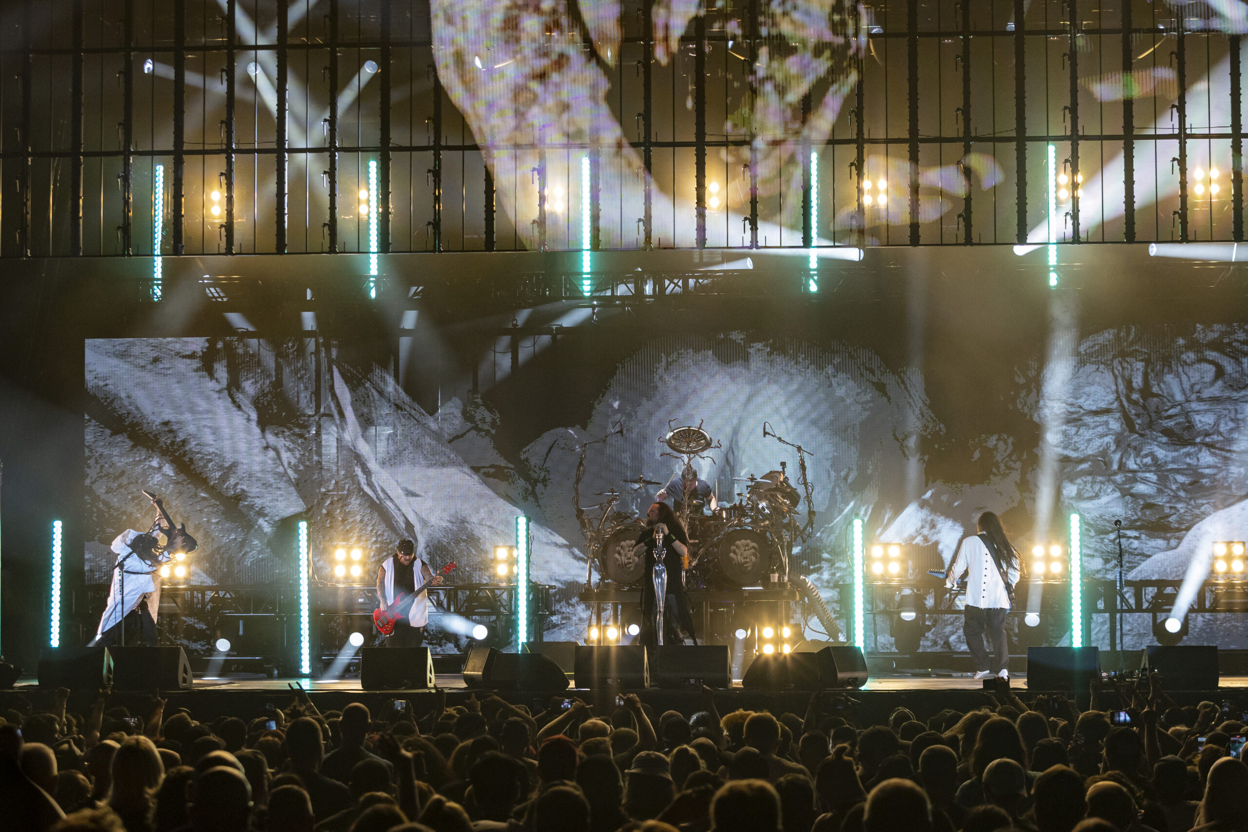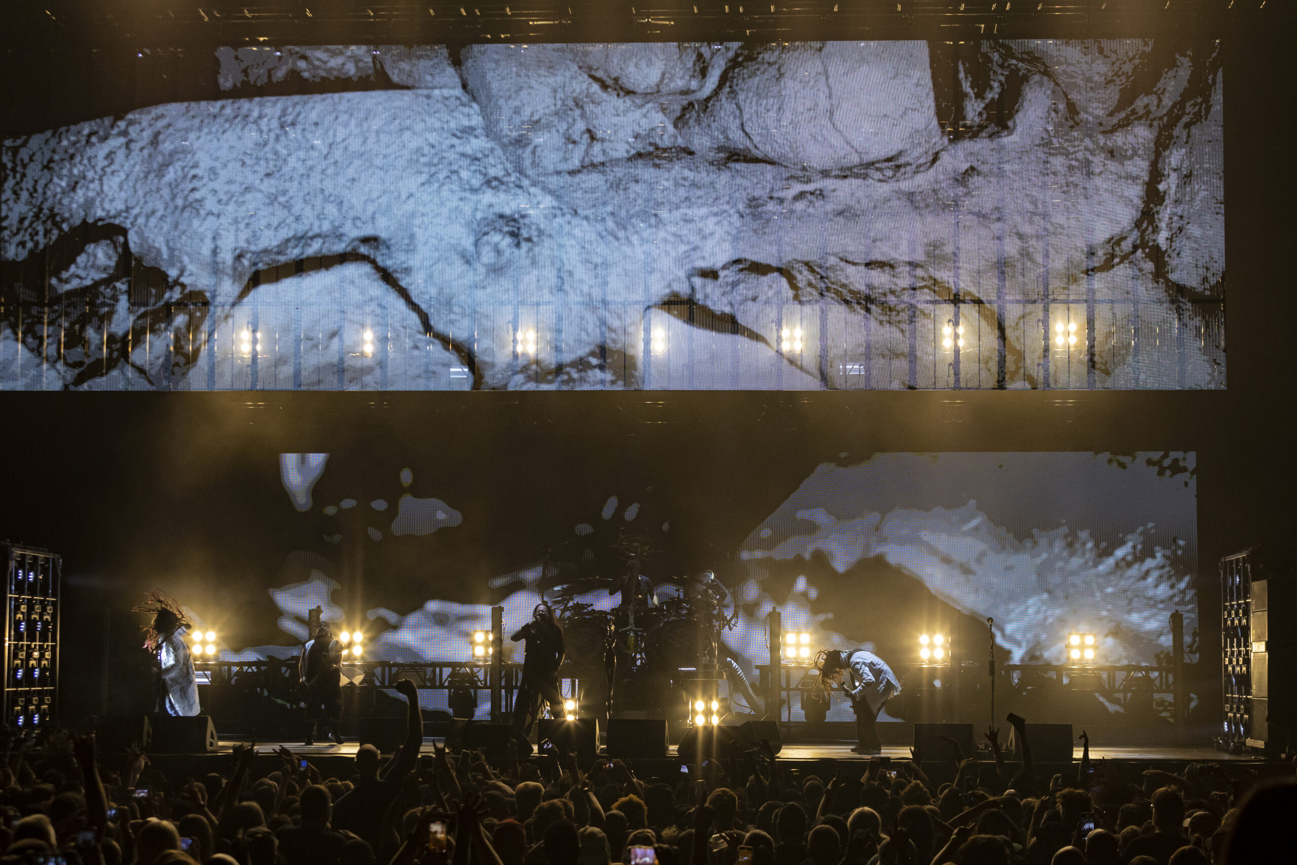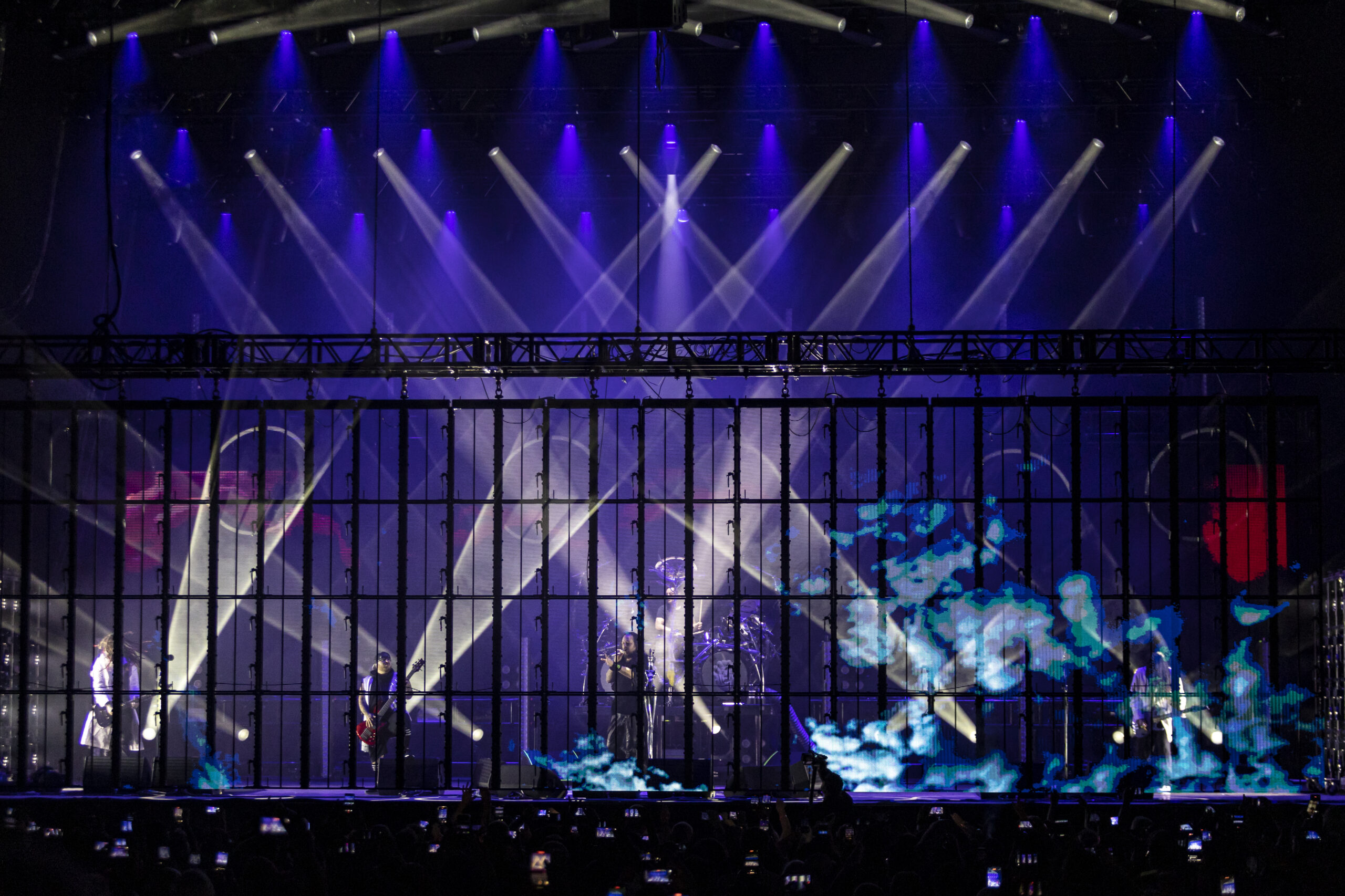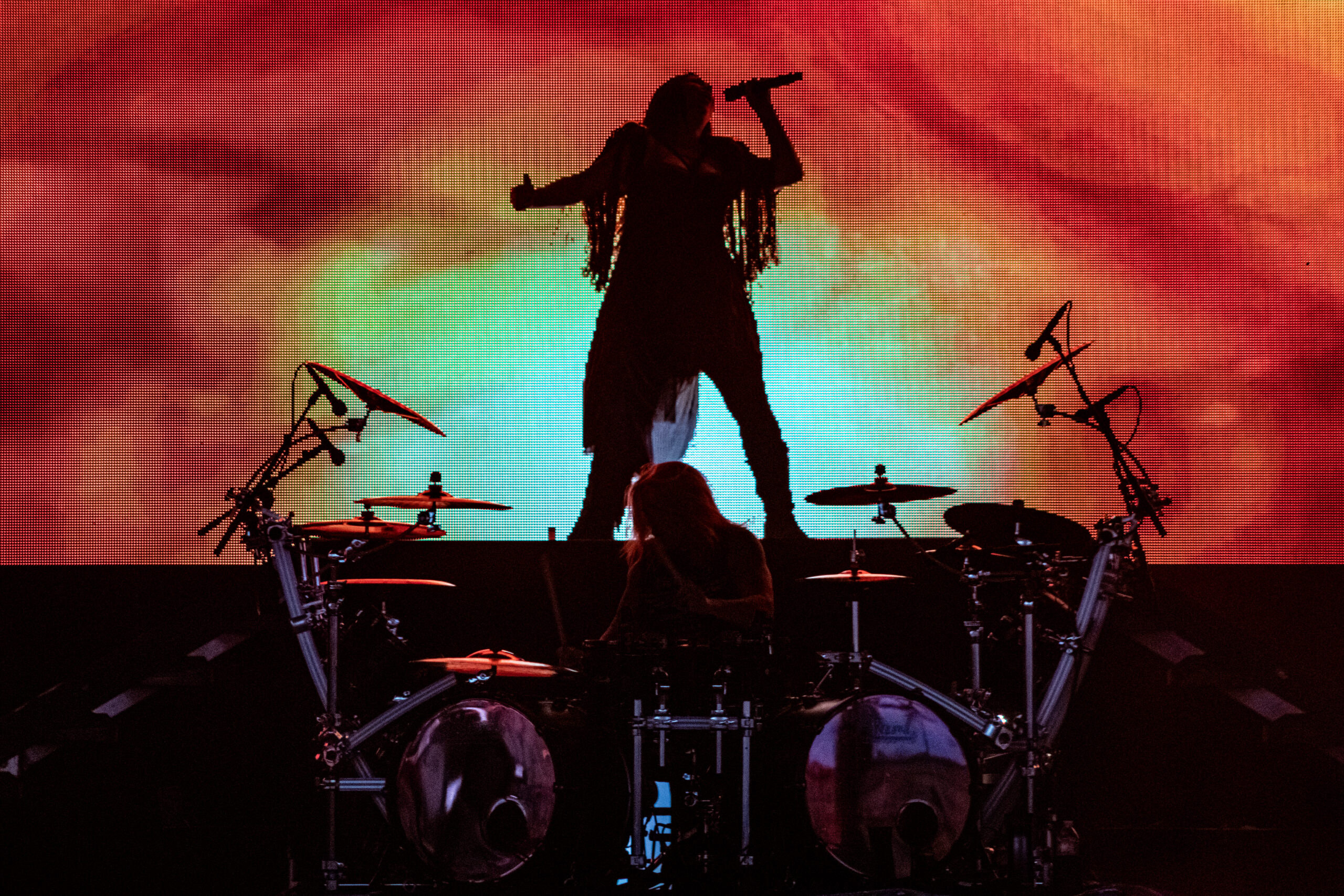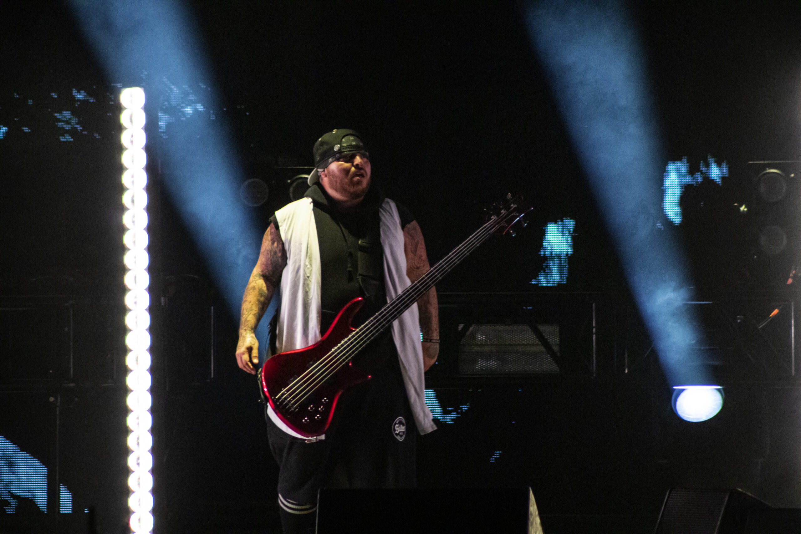 With the abundance of “Still a Freak” shirts through the sea of people. It was clear who people were here to see. As the lights turn off a huge “KORN” logo appears on the LED screens on the front of the stage while “4 U” plays overhead. As the song ends the guys take stage BEHIND the LED wall. At first I was unsure of this but you can see them very clearly and the visuals that are displayed on them are pretty trippy. 1st and 2nd songs were done behind the screen. (Those songs were “Rotting in Vain” and A.D.I.D.A.S.) As the third song was about to start the screen raised up and you had your first “real” glimpse of the boys in KORN as they blasted in with “Here to Stay“. Everyone was showing their true KORN selves. Johnathan with his trademark mic stand headband, Head flipping his dreads around and Munky with his bent over spin. Ray is an absolute beast behind the drum kit and newcomer, but not new to the game, Ra Diaz did an amazing job. We all love and miss Fieldy but Ra did his job and did it very well. With a staggering 16 song set list hitting more old school than I expected the end of the night was quite a surprise for those in attendance with Amy Lee coming out and doing “Freak on a Leash” with KORN. Always an amazing show by these guys. I will be there at the next one for sure.