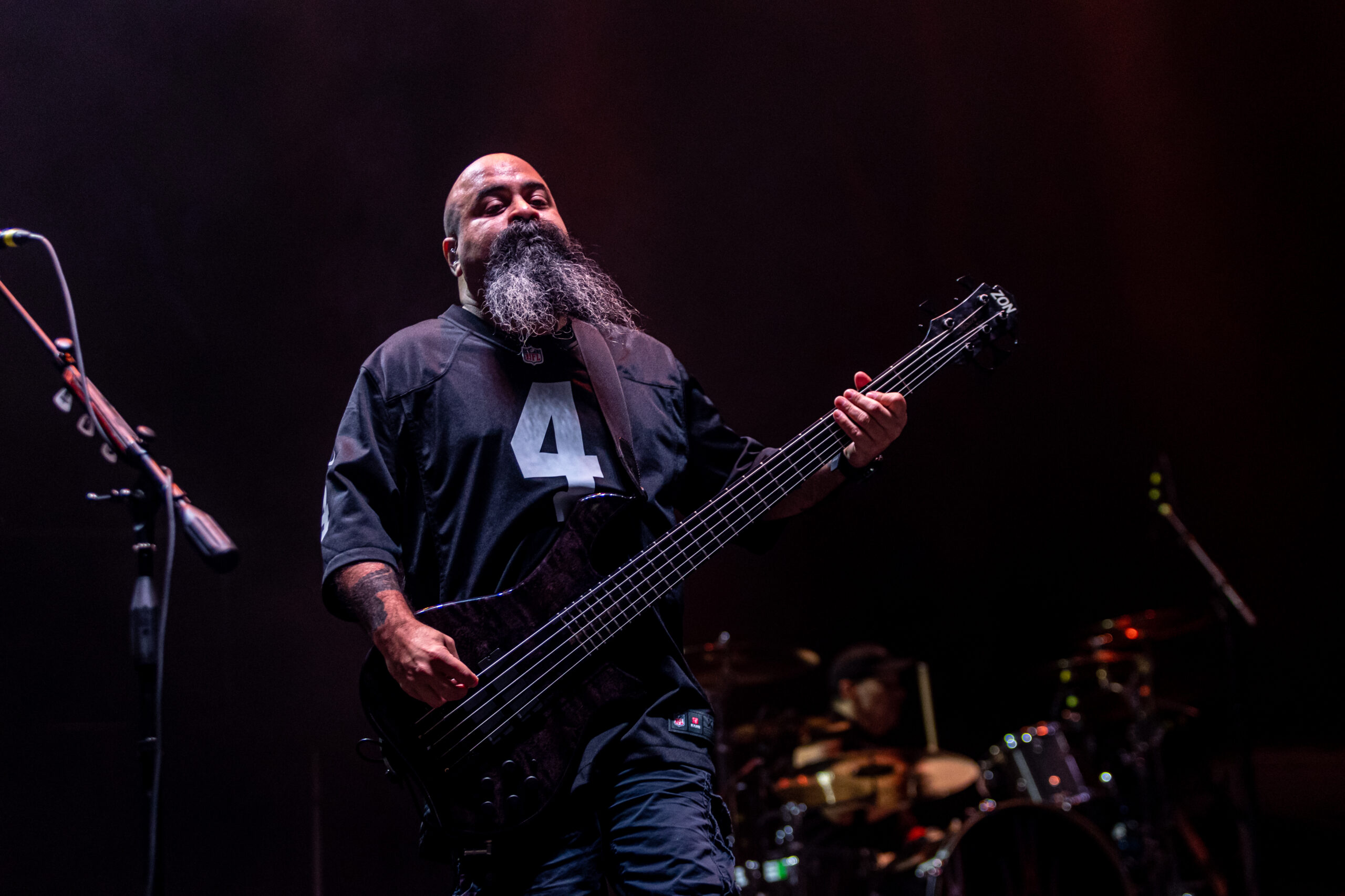 Finally, it was time for Mudvayne to take the stage. A huge sheet with the Mudvayne logo was raised and put in front of the stage. The lights go down and you here singer Chad Gray and the other members of Mudvayne hit HARD with the first few notes of the mega popular song “DIG” as the sheet fall to the ground. Within about a minute Gray hopped down and got right into the audience face screaming the lyrics of “DIG“. I do believe he finished the song with the crowd. “Under My Skin” followed with Mudvayne’s performance exploding like a volcano. Lead guitarist Greg Tribbett rocked a black and red face paint with goggles and his signature liberty spikes. Bassist Ryan Martinie rocking the devil horns and black with silver accent eye makeup. Drummer Matthew McDonough with a white face and black stripes. From what I have seen and read these paints vary from show to show. “-1“, “Death Blooms” and “Internal Primates Forever” follwed. Then the lights went down and a Tribute video started to play. “Cowboys from Hell” blasted in the arena. Chad Gray got on the mic and Talked about how today was Dimebag Darrels birthday and how fitting it was that they are playing on his birthday in his home state! It was destiny. Mudvayne put on one hell of a show despite being away for so long. The intense energy and passion make them a “do not miss act.”