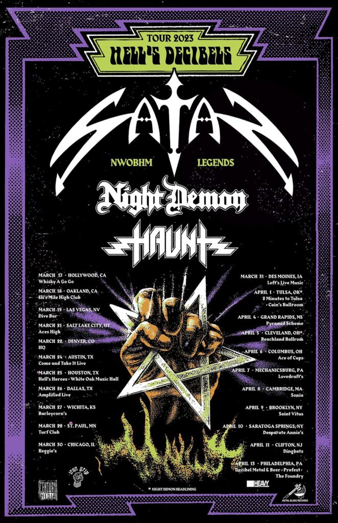 New Wave Of British Heavy Metal icons, SATAN, will return to the stage on a three-week US headlining tour! The Hell’s Decibels Tour 2023 will commence on March 17th in West Hollywood, California and run through April 13th in Philadelphia, Pennsylvania where the band will headline this yearâs Decibel Metal & Beer Fest pre-party. Support will be provided by Night Demon and Haunt.